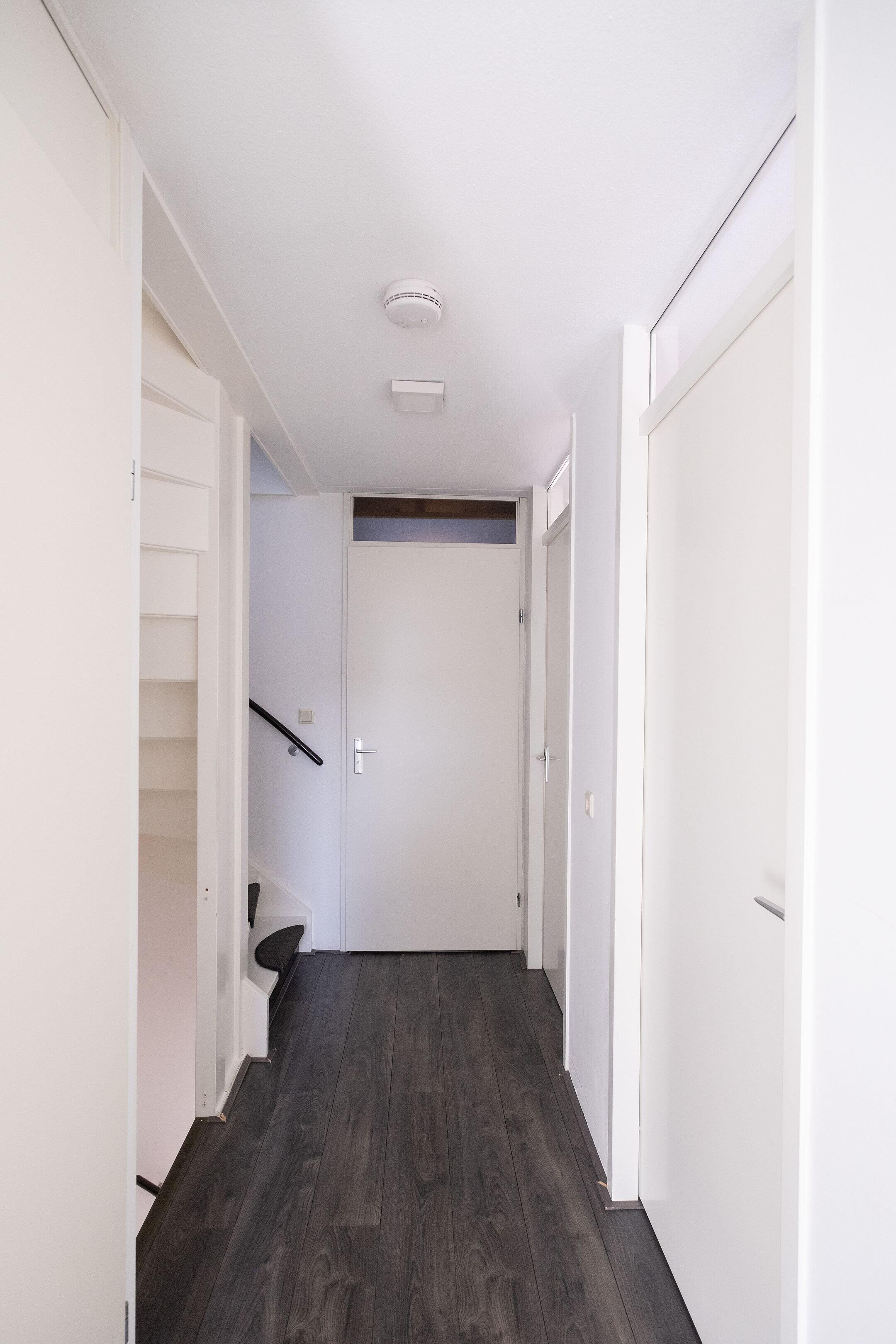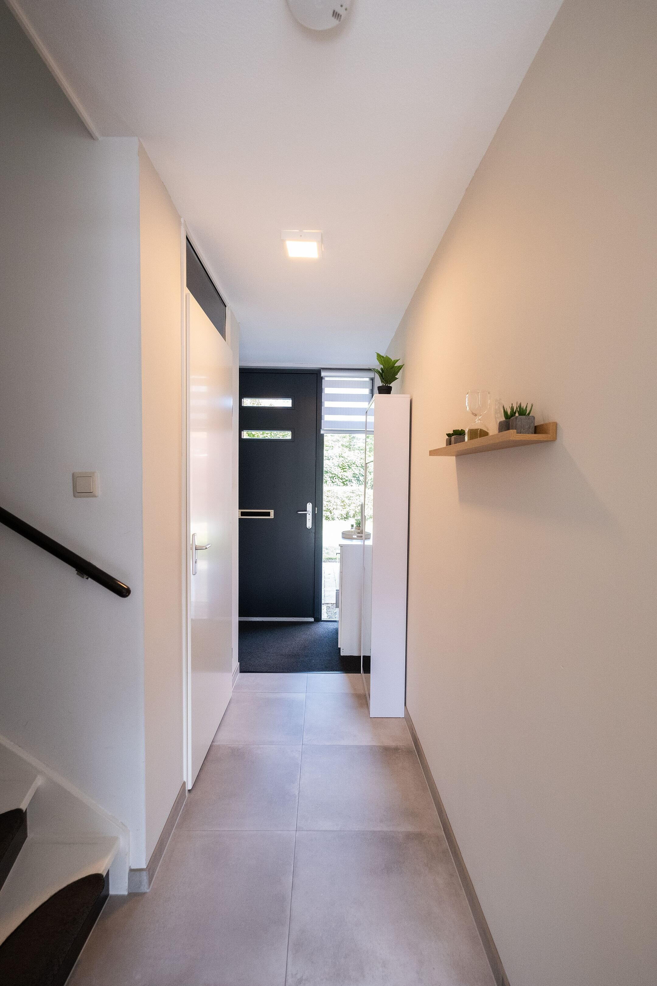 Je komt binnen in een lichte woonkamer met een tegelvloer voorzien van VLOERVERWARMING. De wanden zijn strak afgewerkt en onder de trap is een handige vaste kast aanwezig.
