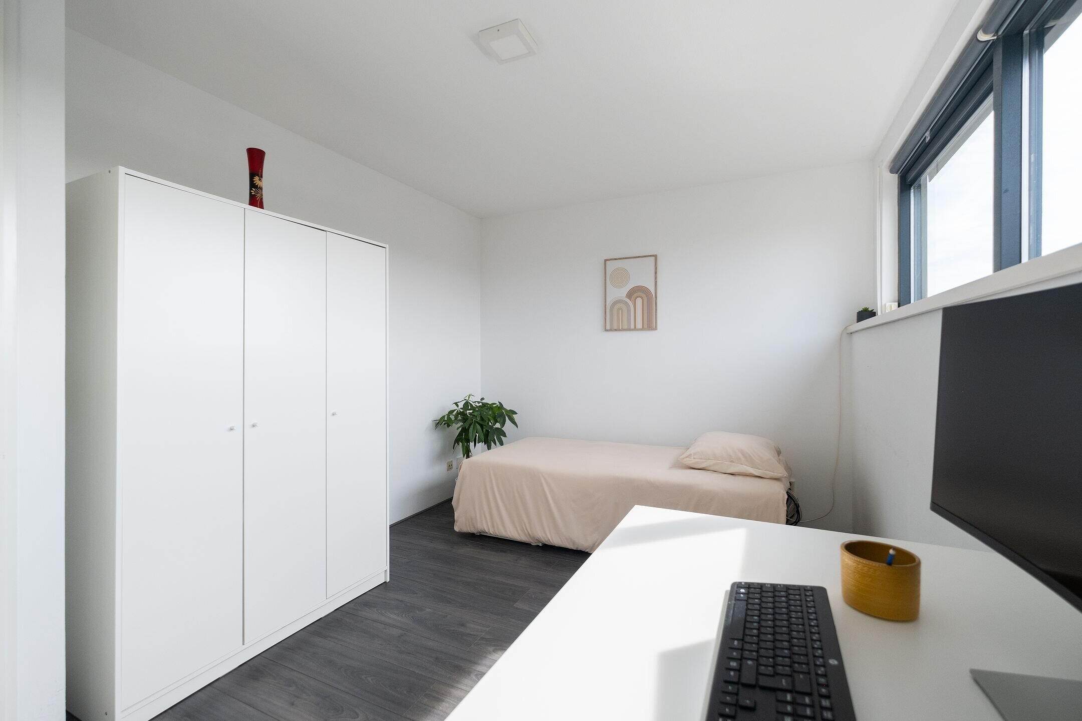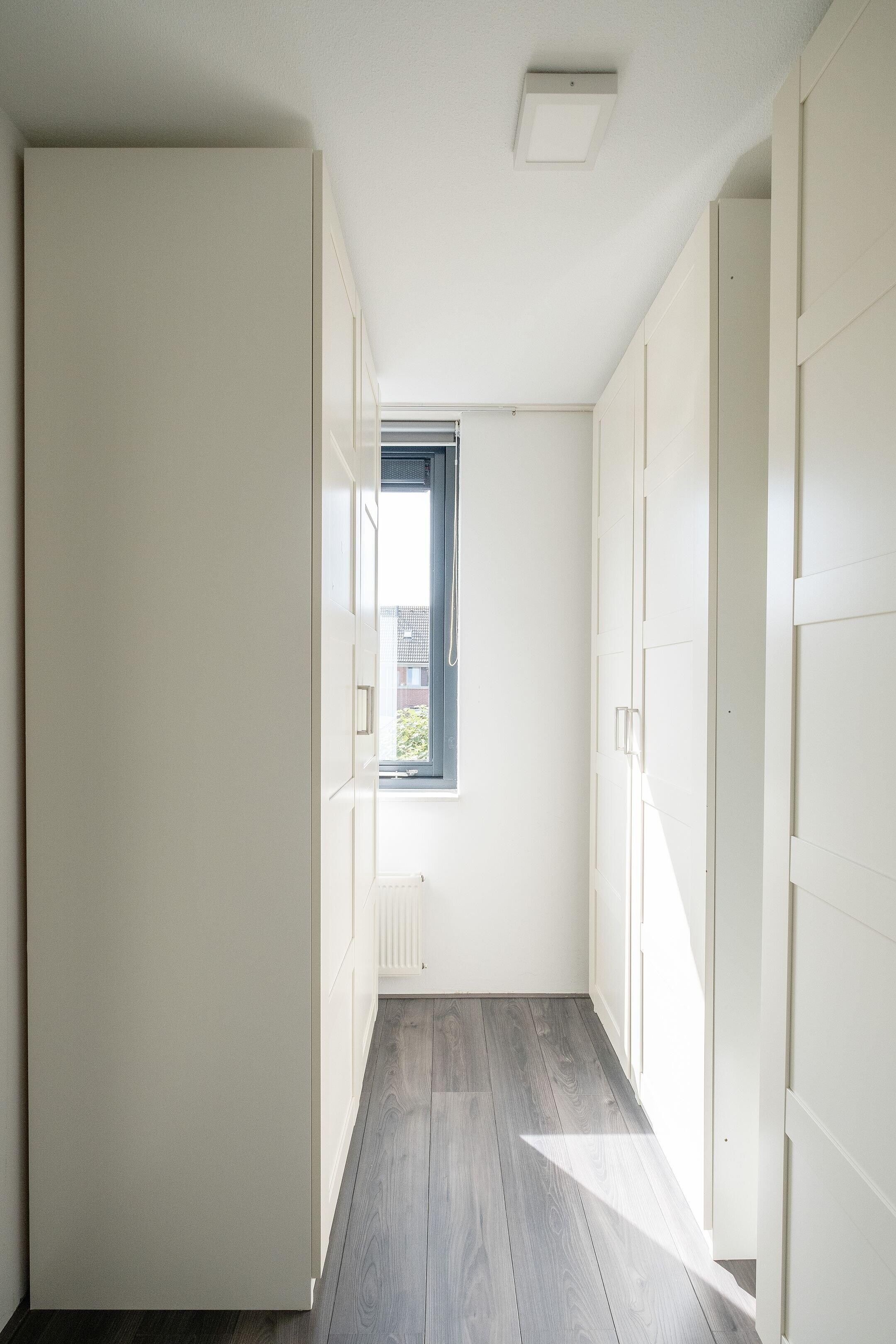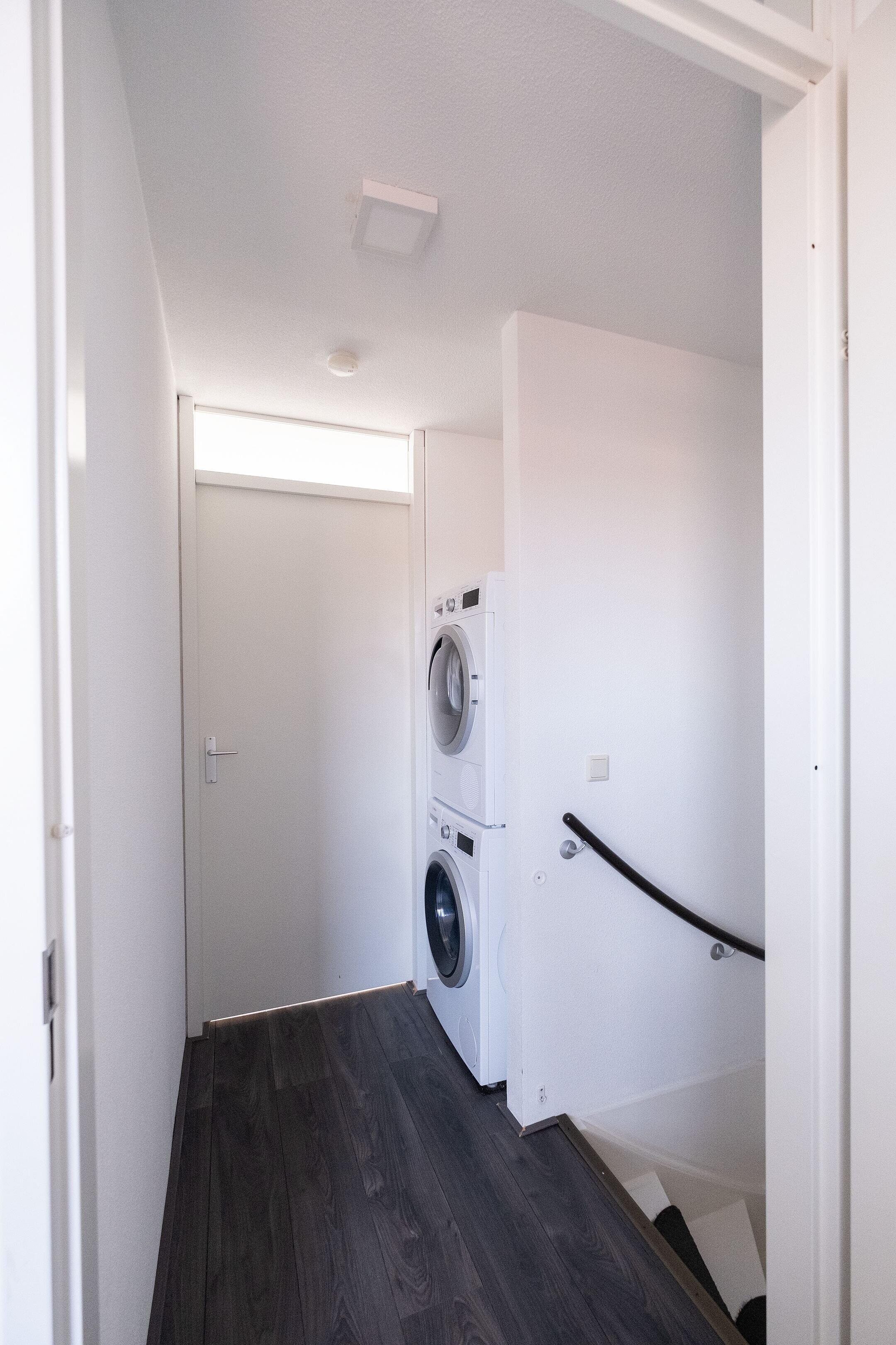 De tweede verdieping biedt nog eens twee slaapkamers en een voorzolder met aansluitingen voor wasmachine en droger. De wanden zijn glad afgewerkt en het raam aan de achterzijde is voorzien van een rolluik.